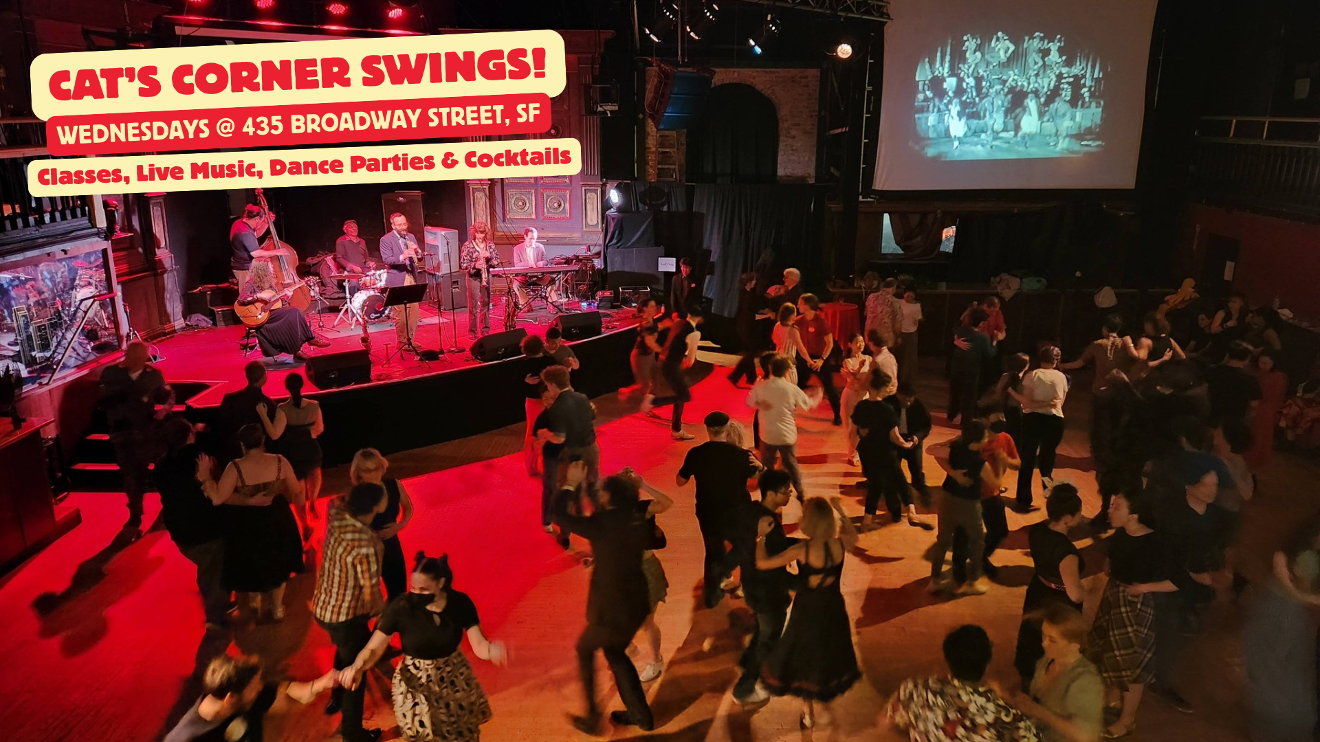 San Francisco’s longest-running swing dance party with live music every Wednesday! Beginner, intermediate, and solo jazz progressive classes—no partner needed! Now at the fabulous 435 Broadway!